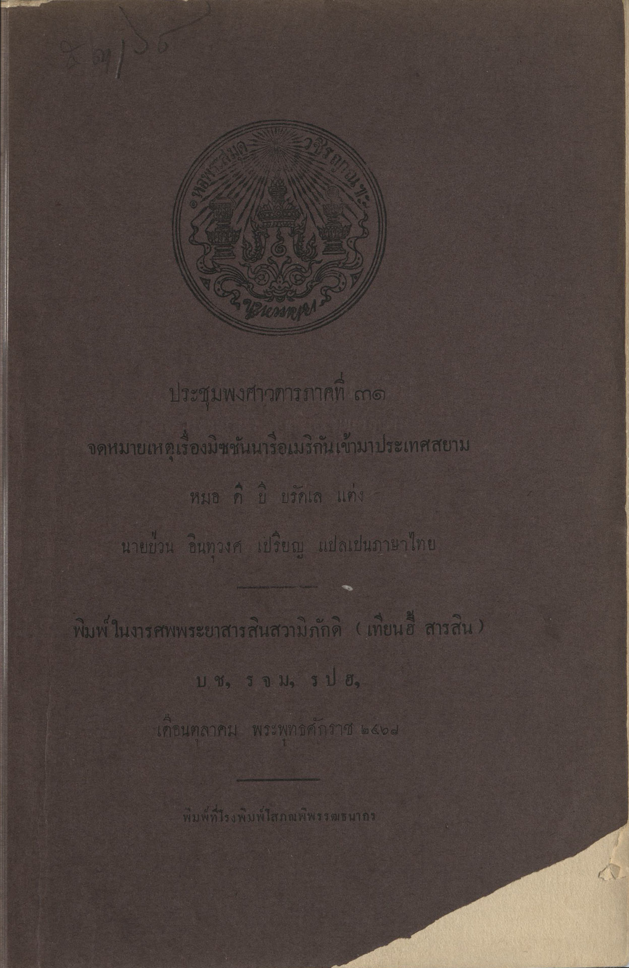 ประชุมพงศาวดารภาคที่ ๓๑ จดหมายเหตุเรื่องมิซชันนารีอเมริกันเข้ามาประเทศสยาม