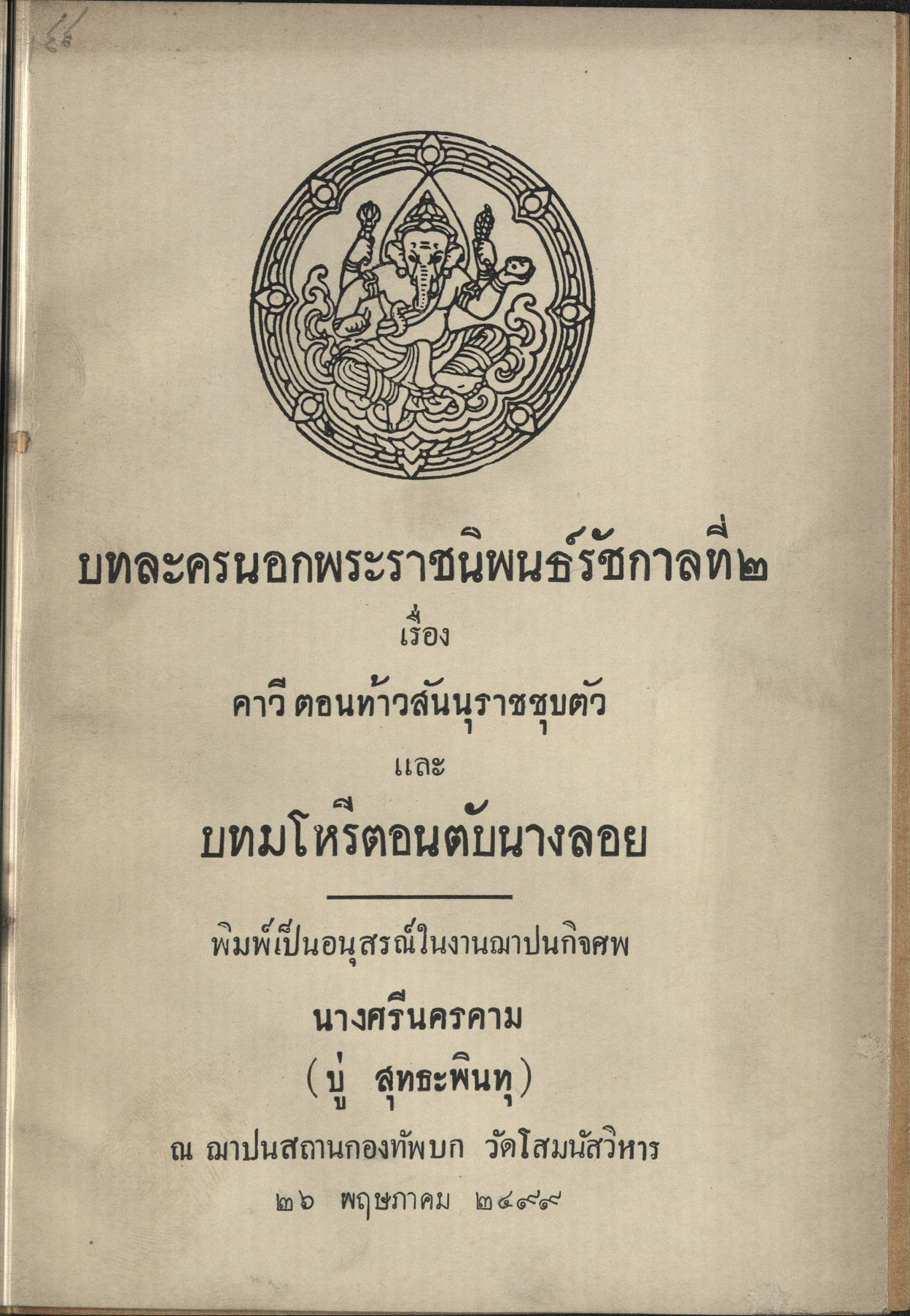 บทละครนอกพระราชนิพนธ์รัชกาลที่ ๒ เรื่อง คาวี ตอนท้าวสันนุราชชุบตัว และ บทมโหรีตอนตับนางลอย